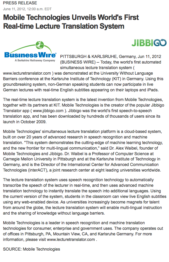 Mobile Technologies Unveils World's First Real-time Lecture Translation System